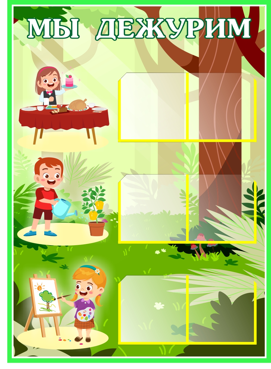 Карманы для размещения карточек с картинками (грибочки, солнышки, животные и т.д.), как на шкафчиках детей. По 2 карточки на каждое дежурство.