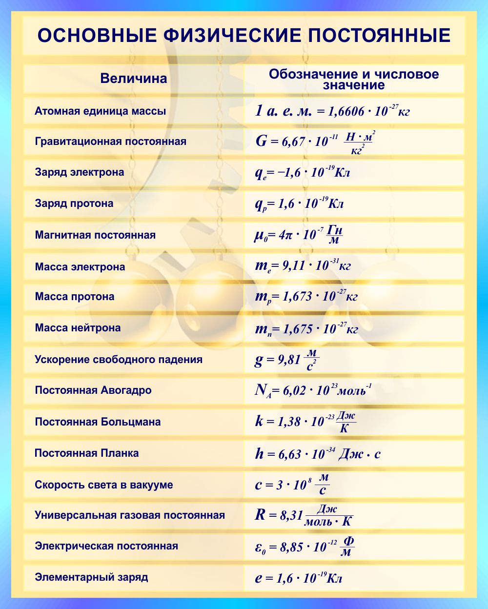 Модель 25184 Стенд Основные физические постоянные для кабинета физики в бирюзовых тонах 800*1000мм