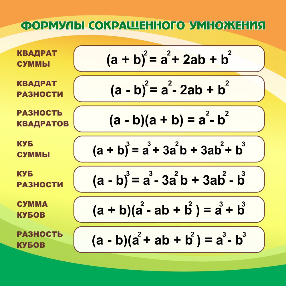 Модель 25225 Стенд Формулы сокращенного умножения в кабинет математики в оранжево-зеленых тонах 750*750мм