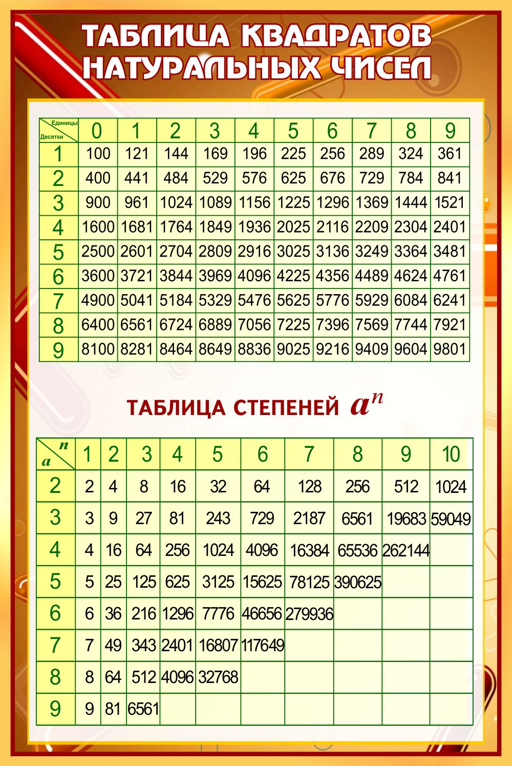 Модель 25179 Стенд Таблица квадратов натуральных чисел в кабинет математики в коричневых тонах 430*650 мм