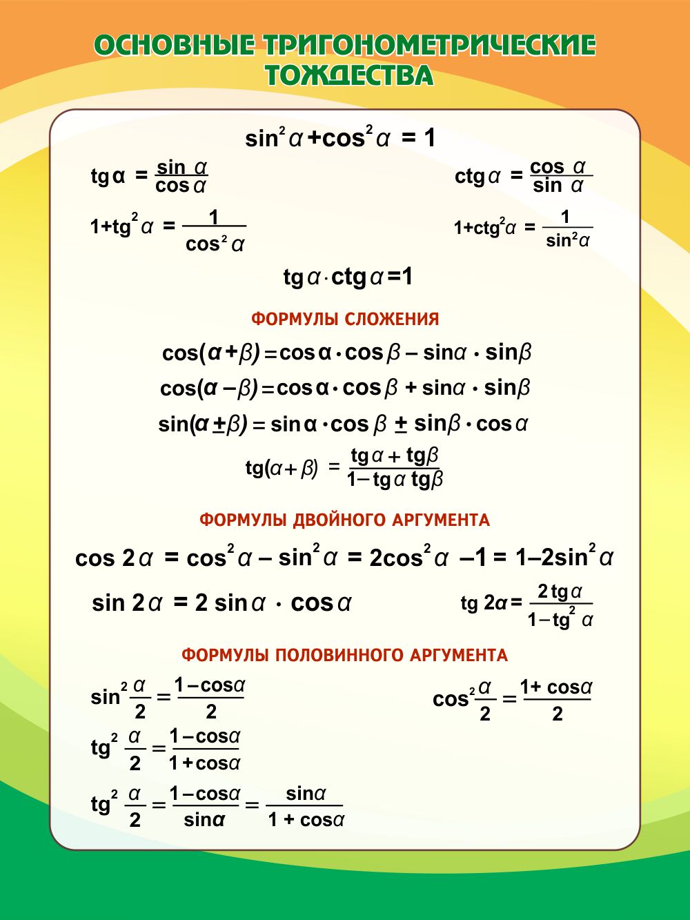 Стенд Основные тригонометрические тождества в кабинет математики в оранжево-зеленых тонах.