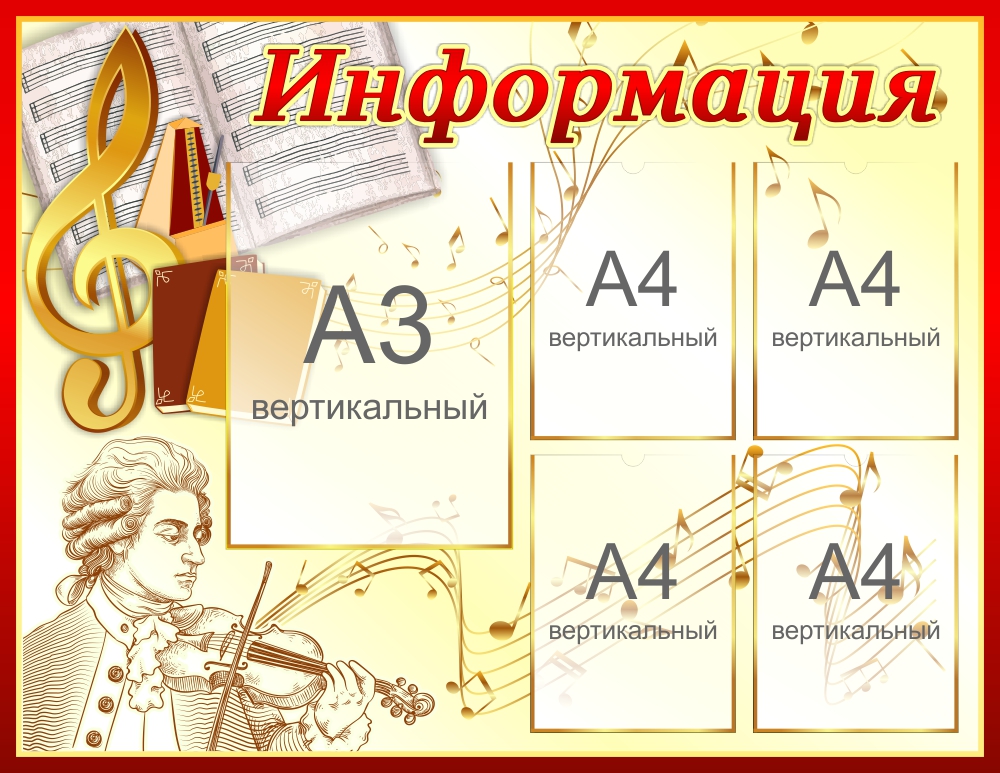Гарантия качества Стенд Информация. Дизайн стенда выполнен в золотисто-коричневых тонах с изображением музыкальных инструментов.