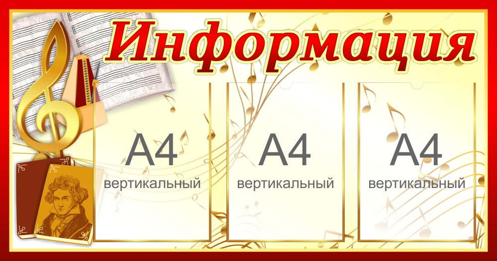 Гарантия качества Стенд Информация. Дизайн стенда выполнен в золотисто-коричневых тонах с изображением музыкальных инструментов.