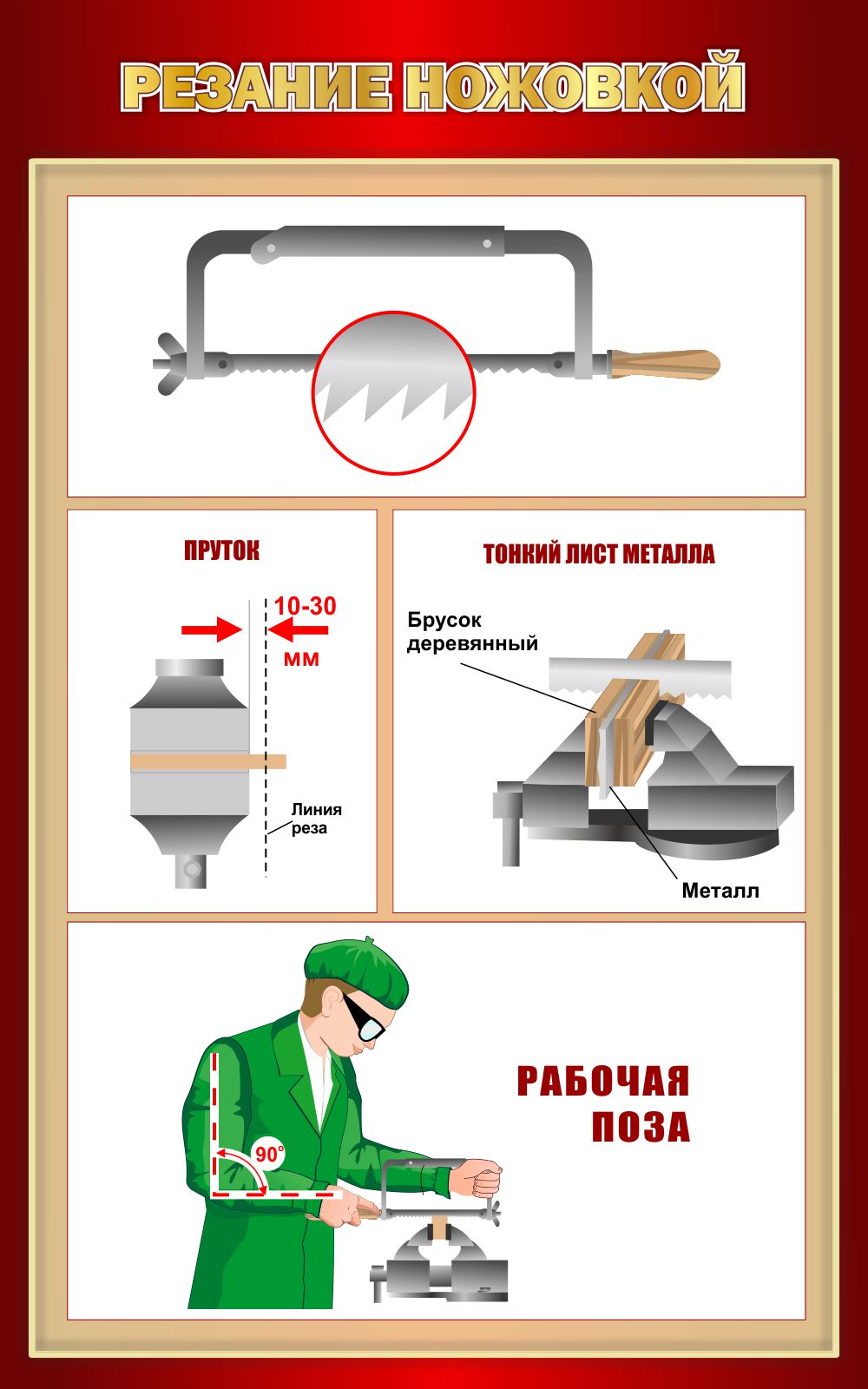 Стенд Резание ножовкой в столярных изделиях в бордовых тонах 500*800 мм