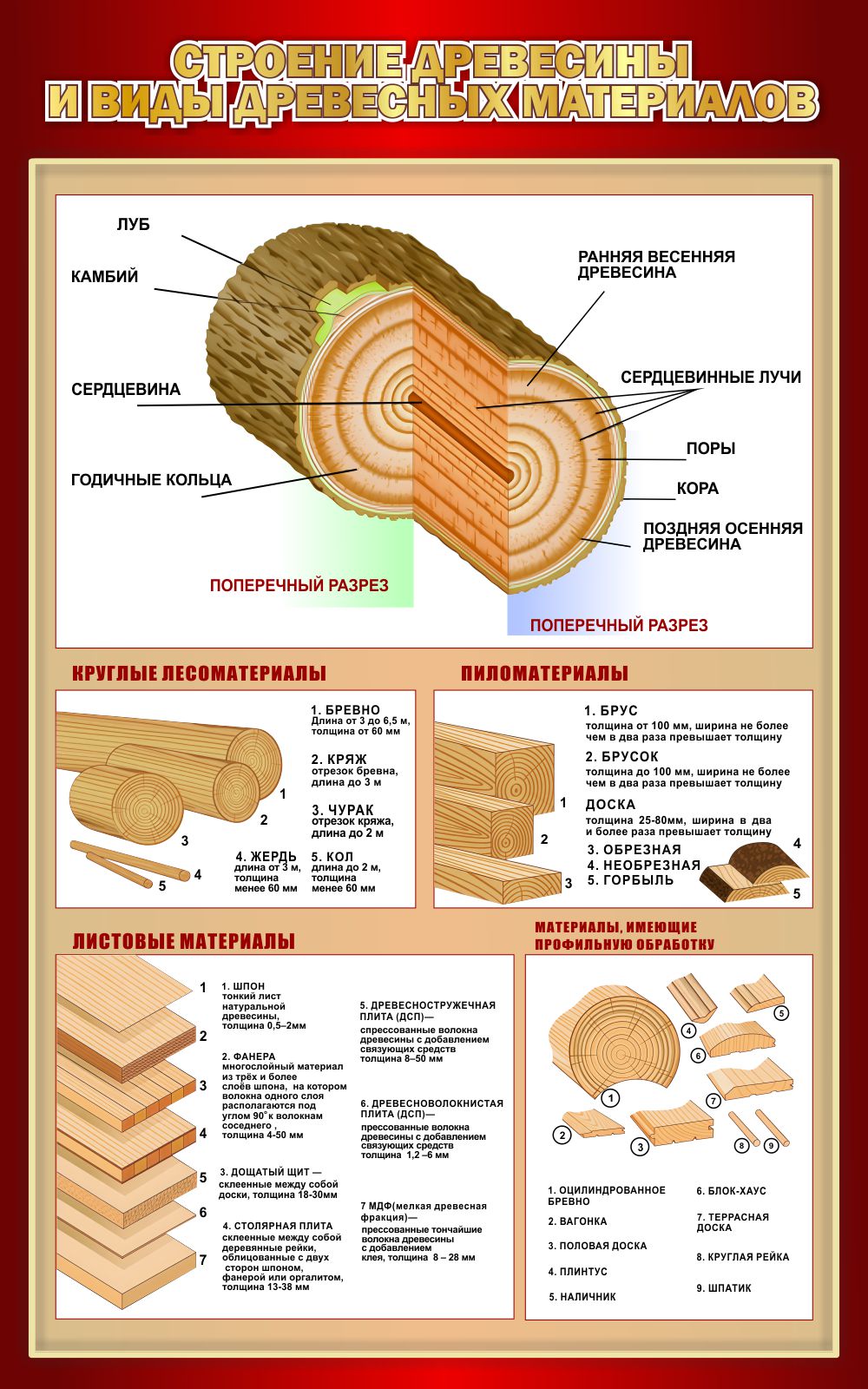 Модель 25207 Стенд Строение древесины и виды древесных материалов в бордовых тонах 500*800 мм